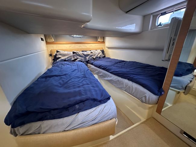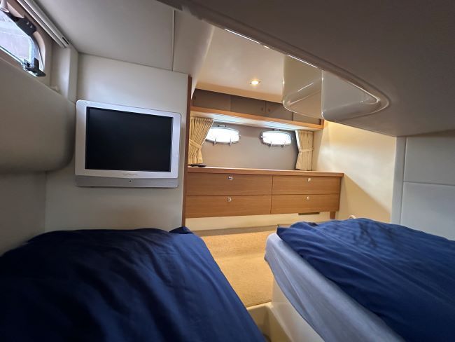 Aft cabin with twin or double berths, TV & DVD, vanity unit with plenty of storage and sink.