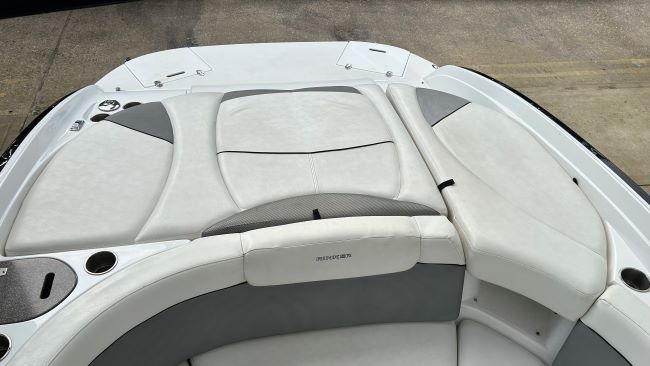 Step aboard the integrated swim platform, check out the transom wakeboard storage trunk with built-in rumble seat. Gaze across the oversized sun lounger and transom walk thru toward the handsome ergonomic helm.