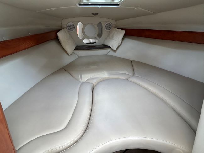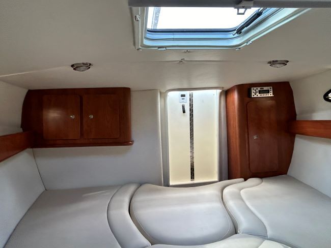 Large V berth in bow with cream upholstery with chemical toilet and cupboard space.