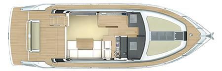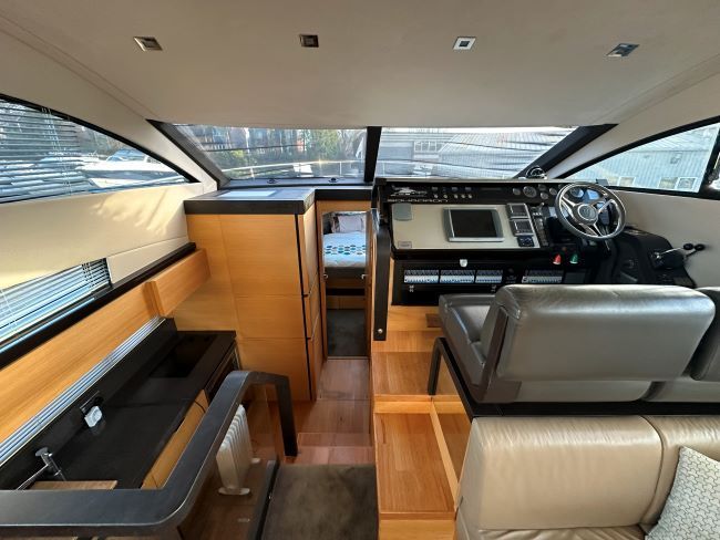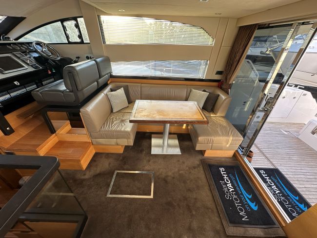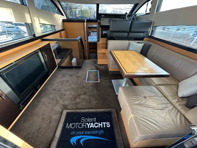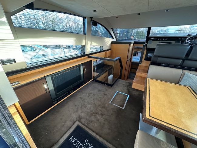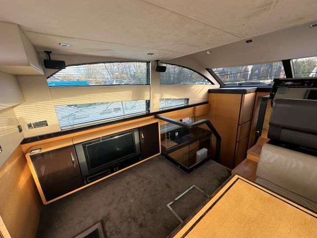 32” pop up flatscreen TV, TV aerial socket, Bose 321 CD/DVD/radio with iPod dock, Intellian sat TV receiver, Blinds to side windows, Curtains to patio door, Dining table, Full-height standing headroom, Full length saloon windows, Halogen ceiling lights, Handrail with glass partition leading to galley, White leather U-shaped sofa converts to double berth
