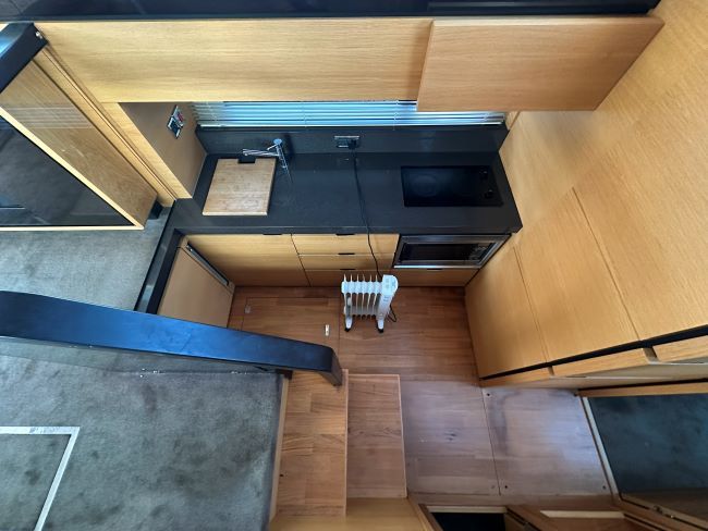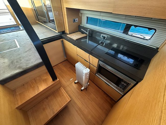 Sharp combination microwave oven, 2 burner elec hob, S/S sink with mixer tap, large fridge, upgraded Fairline melamine crockery & Fairline glassware with moulded stowages, drawers & extra storage