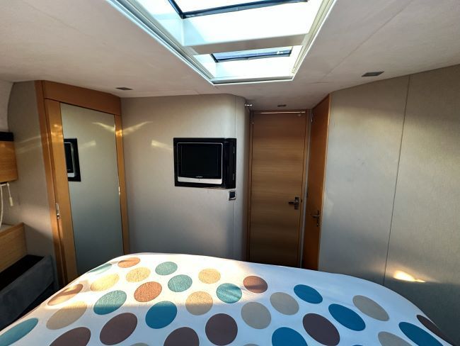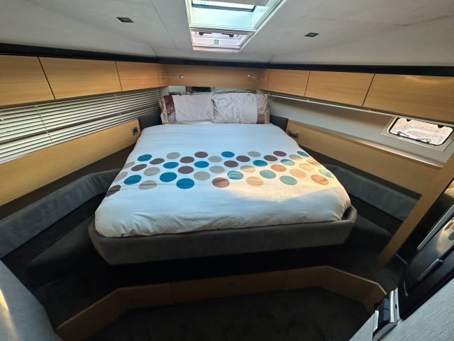 Oversized double bed, Reading lights, Bedside table, Drawer under bed, Digital safe, Full-height standing headroom, Halogen ceiling lights, Large hatch with flyscreen and concealed blinds to foredeck, Lockers (overhead), Master cabin skylight, Mirror, Opening hull windows with blinds, Wardrobe