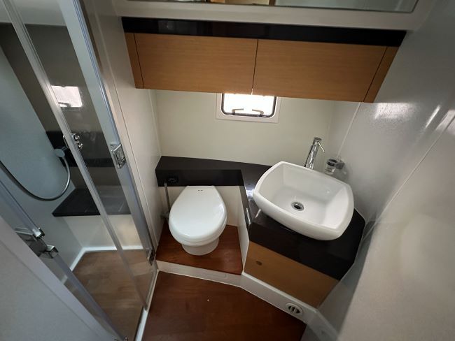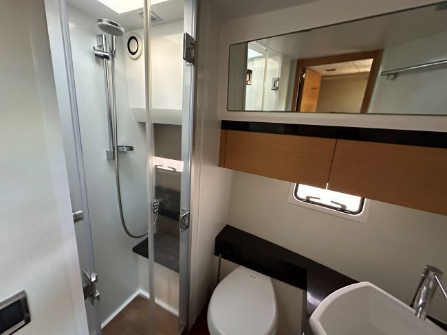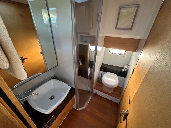 Shaving point, Automatic shower tray pump-out system, Day access, Electric silent-flush freshwater toilet, Extractor fan, vanity unit locker and basin with hot and cold pressurised water, Full set of bathroom fittings, Full standing height shower with solid teak gratings, seat and hinged door, Mirror, Opening hull windows with blinds