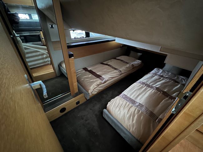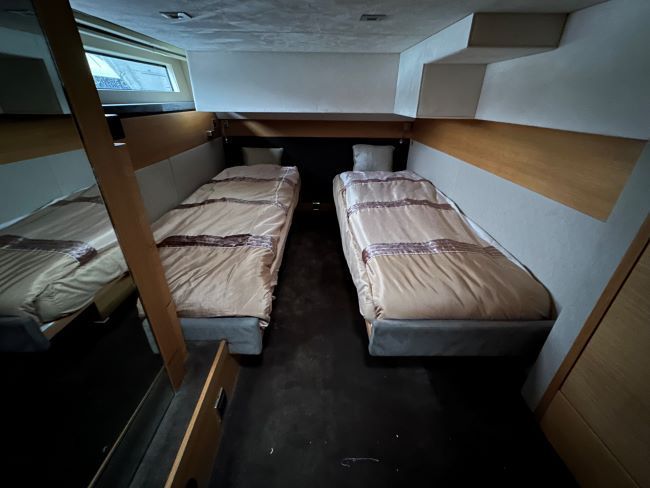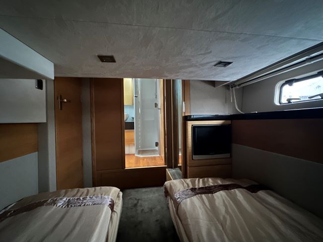 Full length berths x 2 with sliding conversion to double, Bedside stowage, Double doors to en suite, Halogen ceiling lights, Lockers , Mirror, Opening hull windows with blinds, Reading lights, Wardrobe