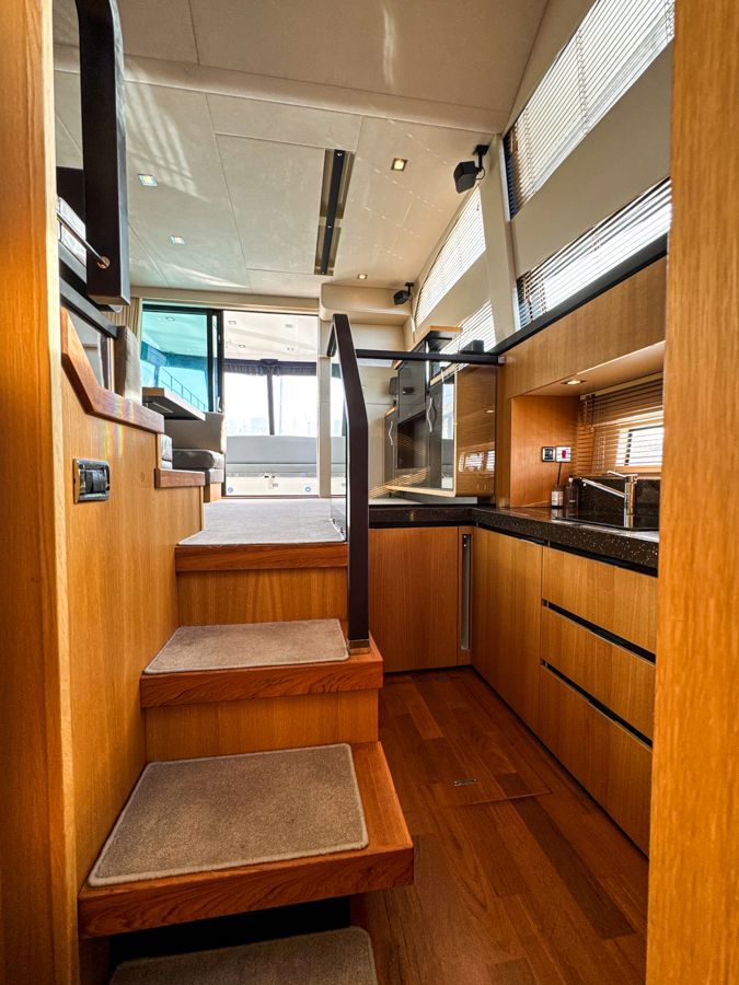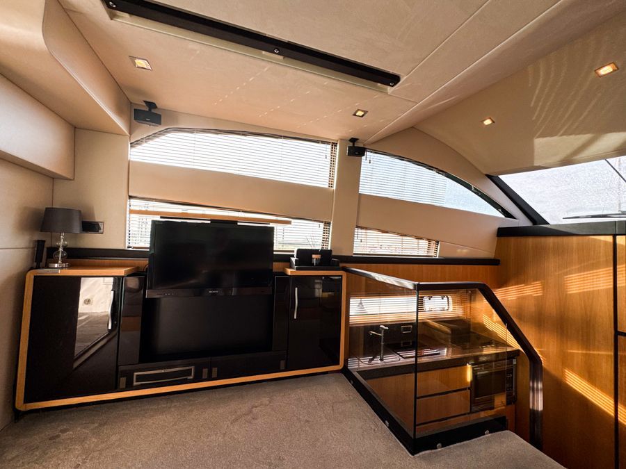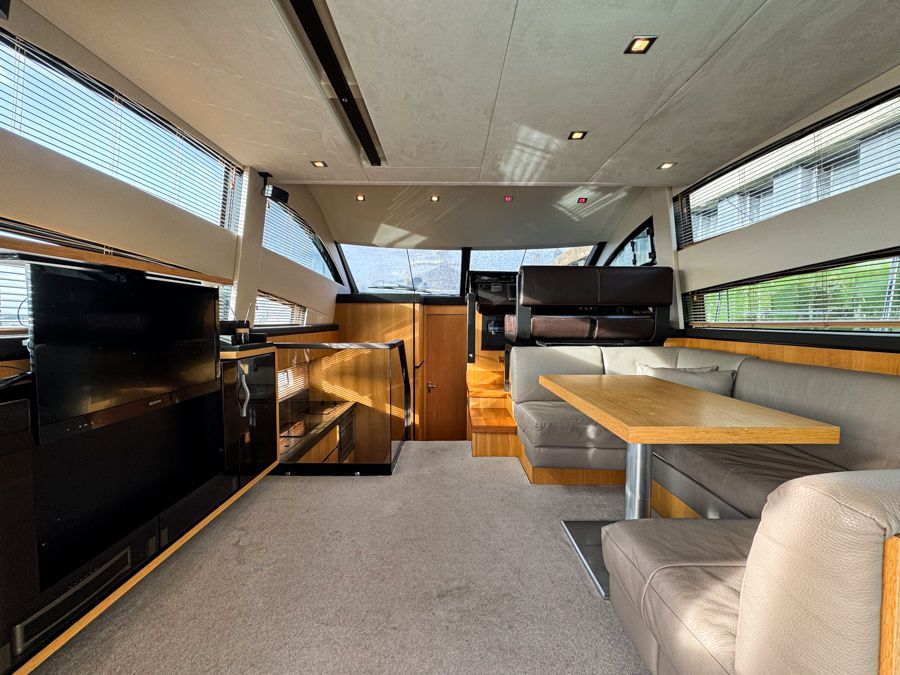 32” pop up flatscreen TV, TV aerial socket, Bose 321 CD/DVD/radio with iPod dock, Intellian sat TV receiver, Blinds to side windows, Curtains to patio door, Dining table, Full-height standing headroom, Full length saloon windows, Halogen ceiling lights, Handrail with glass partition leading to galley, White leather U-shaped sofa converts to double berth