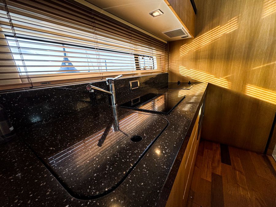 Sharp combination microwave oven, 2 burner elec hob, S/S sink with mixer tap, large fridge, upgraded Fairline melamine crockery & Fairline glassware with moulded stowages, drawers & extra storage