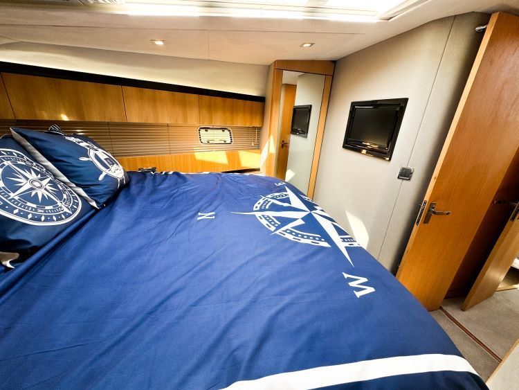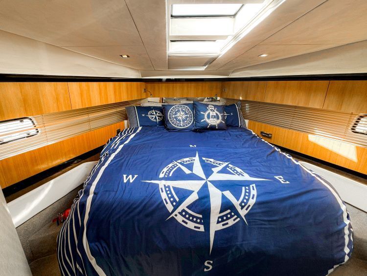 Oversized double bed, Reading lights, Bedside table, Drawer under bed, Digital safe, Full-height standing headroom, Halogen ceiling lights, Large hatch with flyscreen and concealed blinds to foredeck, Lockers (overhead), Master cabin skylight, Mirror, Opening hull windows with blinds, Wardrobe