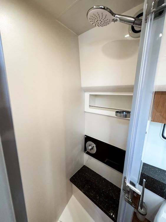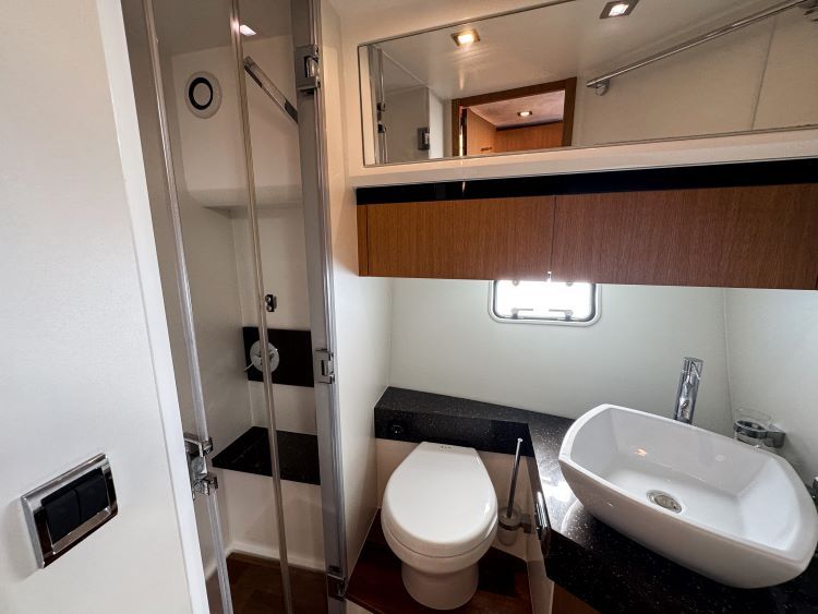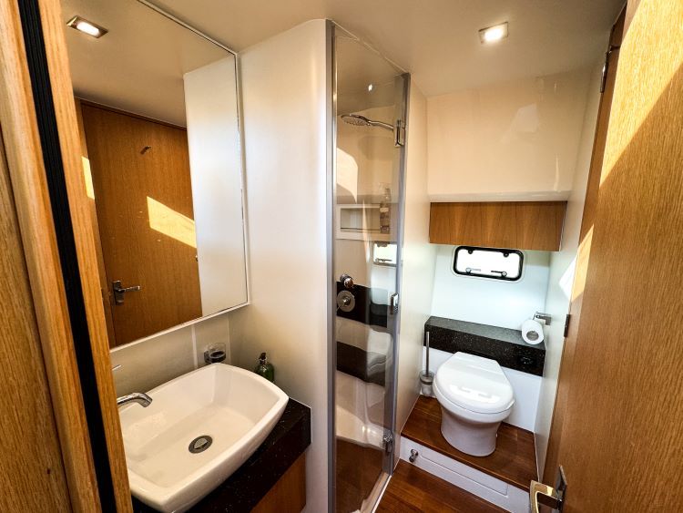 Shaving point, Automatic shower tray pump-out system, Day access, Electric silent-flush freshwater toilet, Extractor fan, vanity unit locker and basin with hot and cold pressurised water, Full set of bathroom fittings, Full standing height shower with solid teak gratings, seat and hinged door, Mirror, Opening hull windows with blinds