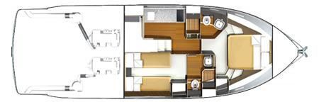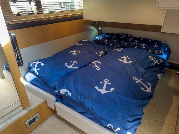 Full length berths x 2 with sliding conversion to double, Bedside stowage, Double doors to en suite, Halogen ceiling lights, Lockers , Mirror, Opening hull windows with blinds, Reading lights, Wardrobe