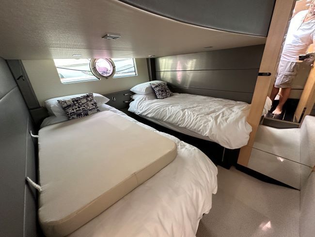 Spacious mid cabin for 3 in triple single berths or a double and a single and plenty of storage.