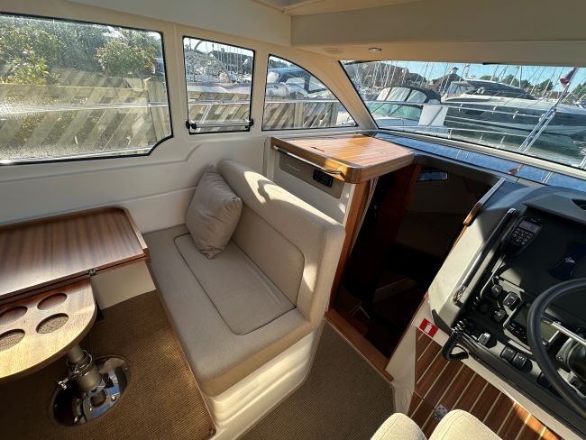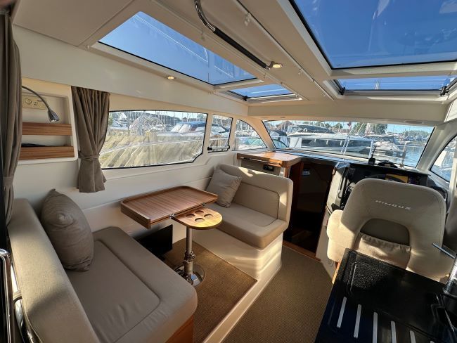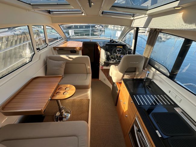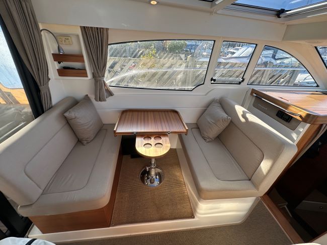 Saloon to port with bench seats with hi/lo dining table that converts to double berth if required