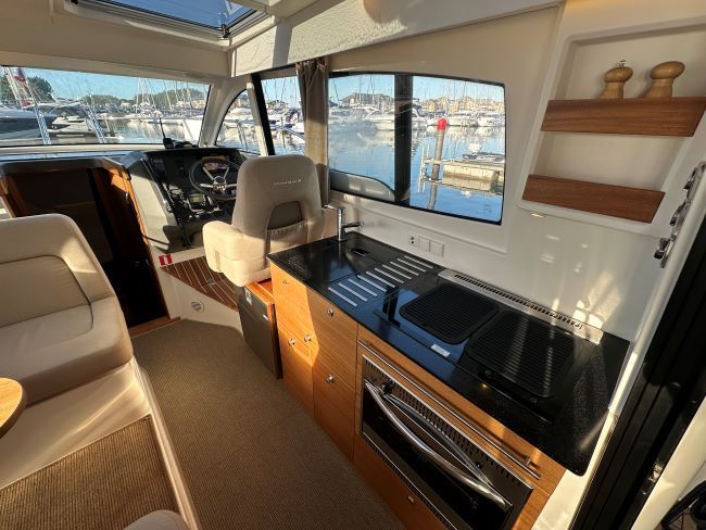 Galley to starboard with corian worktop and ENO two-burner hob with oven and grill
