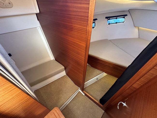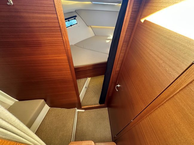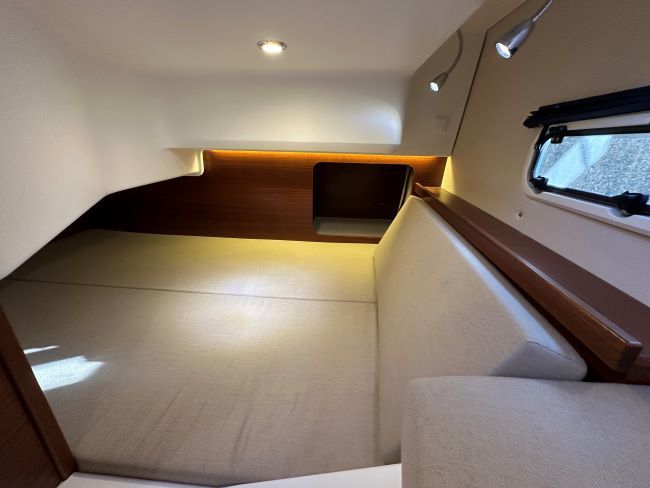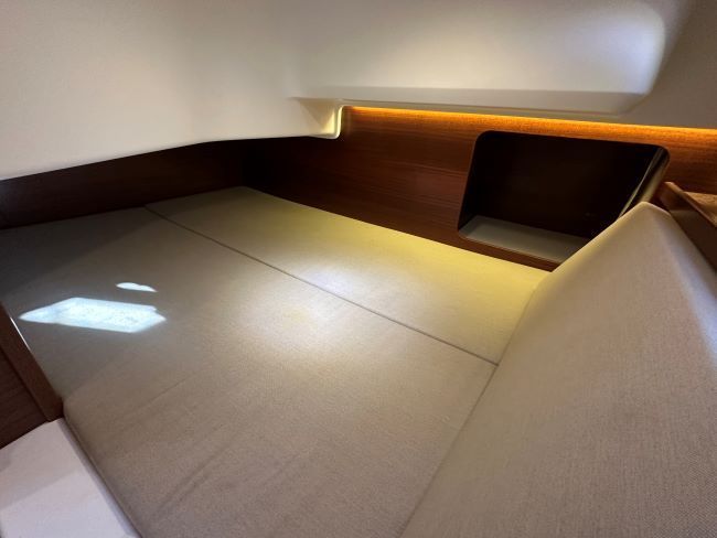 Mid cabin with generous transverse double berth, additional storage and twin LED reading lights