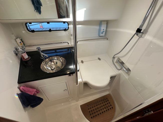 Heads compartment with manual sea water flush WC with Sea Smart inline smell neutraliser to holding tank (new skin fitting – May 2023)
