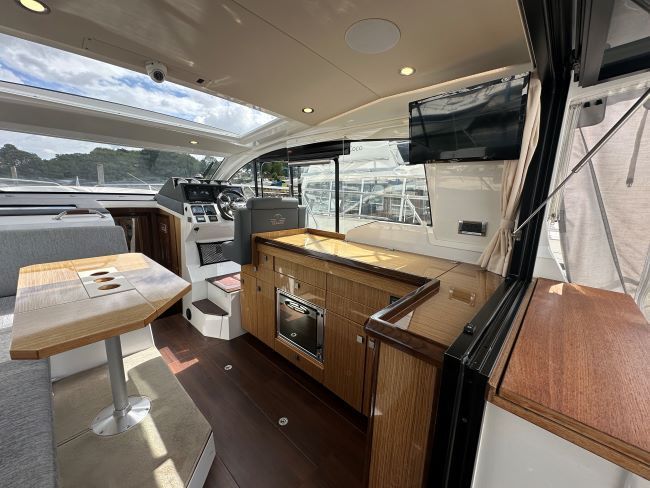 New Raymarine navigation suite, Atlanta high gloss walnut interior, leather saloon seating, carpets, electric sliding