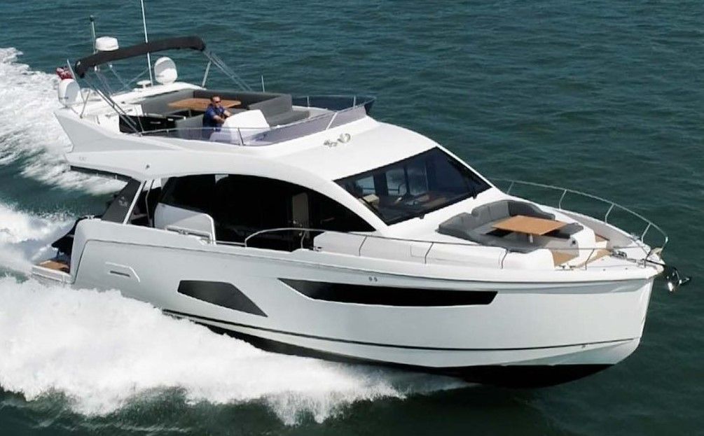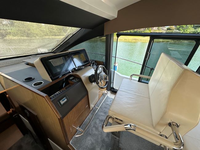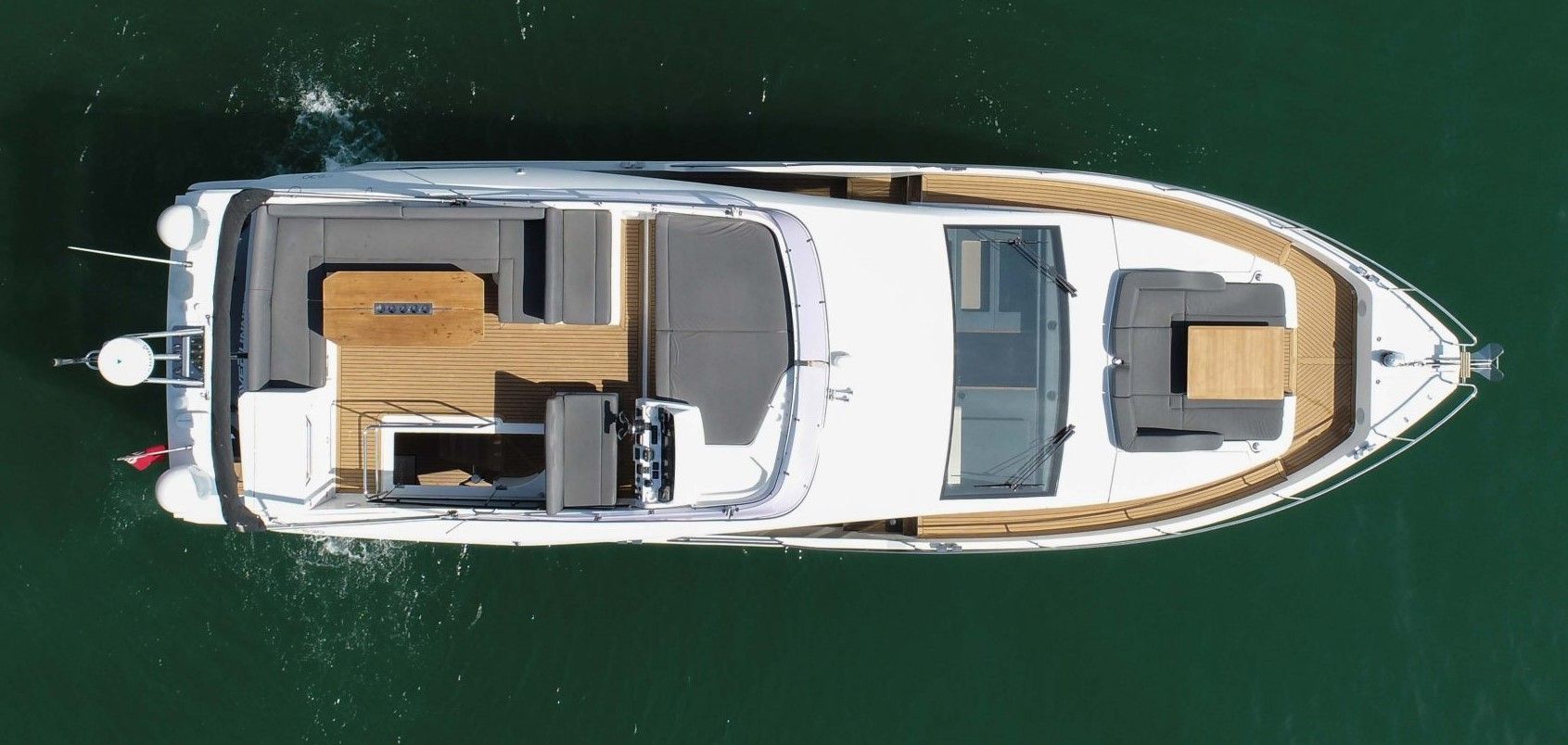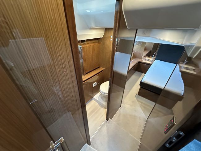 She is a large and spacious 3 cabin plus 1 crew flybridge with sports cruiser performance with the largest engine option being the Volvo Penta D8-IPS800 drives with a joystick and Dynamic Positioning to make manoeuvring and crewing a breeze with the walk around sidedeck access from the rear cockpit and twin saloon side deck doors.