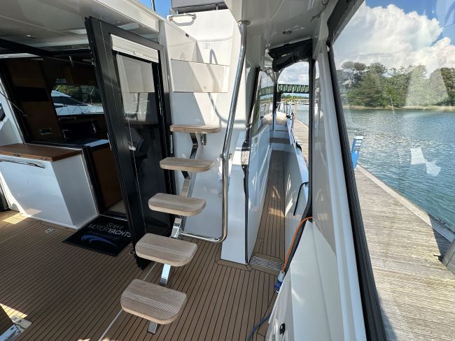Big "L" shaped seating in cockpit connected on same level through to the side decks and wide bifold patio doors and raising galley window links the cockpit seamlessly to the interior.