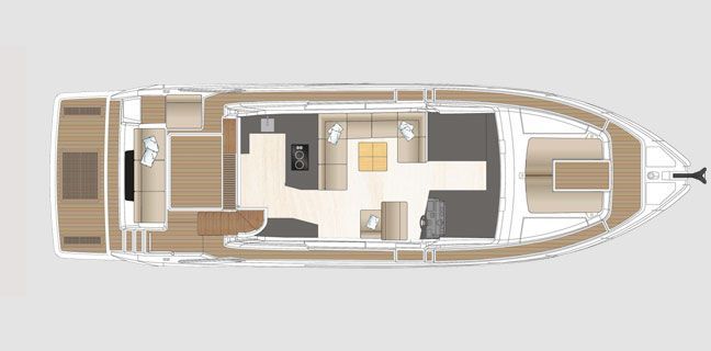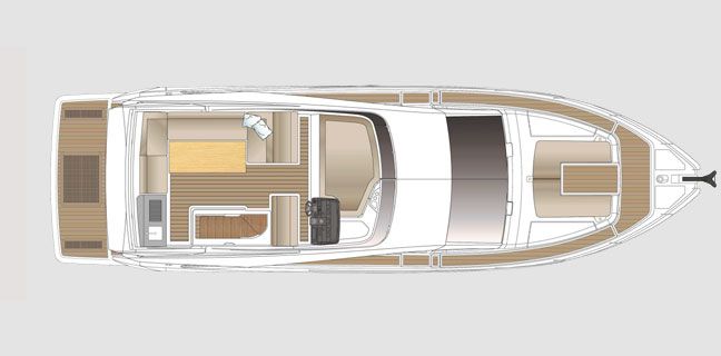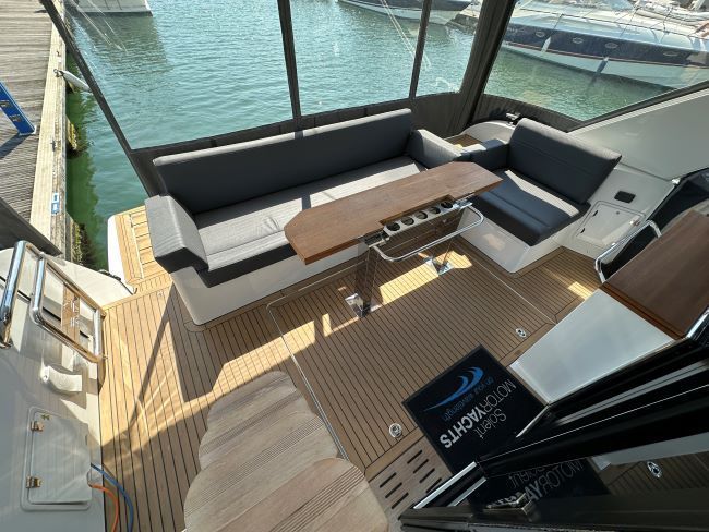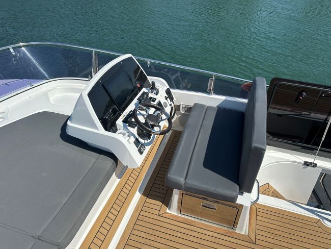 Large sociable flybridge, with "C" shaped aft seating and forward co-pilot seating, sunpad and twin helm seat.