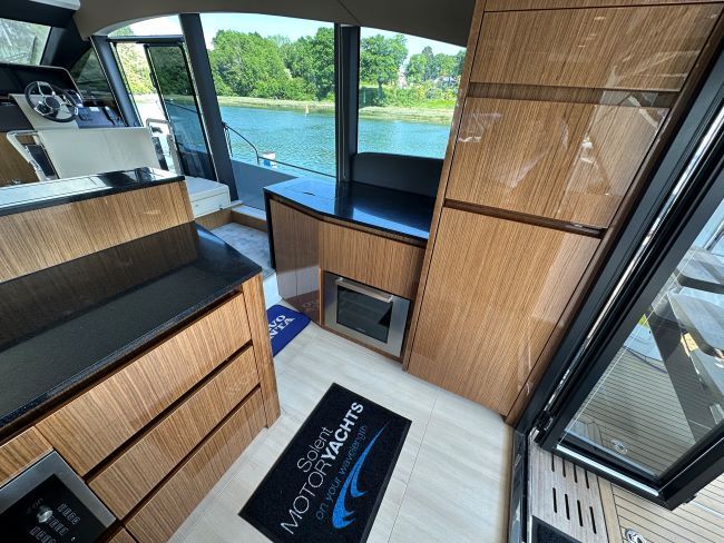 Aft galley to port with fold out drink bar to cockpit, 4 ring hob, combination oven, drawers, pop up drinks cabinet, plenty of storage and overhead locker with large fridge and spate freezer to stb with the additional wine cooler and more storage.
