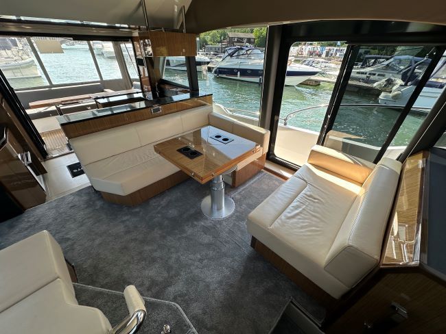 Spacious saloon with adaptable saloon seating with hi’lo dining table with panoramic windows with side deck access, lower helm station with folding helm seat.