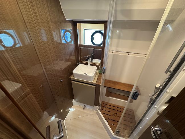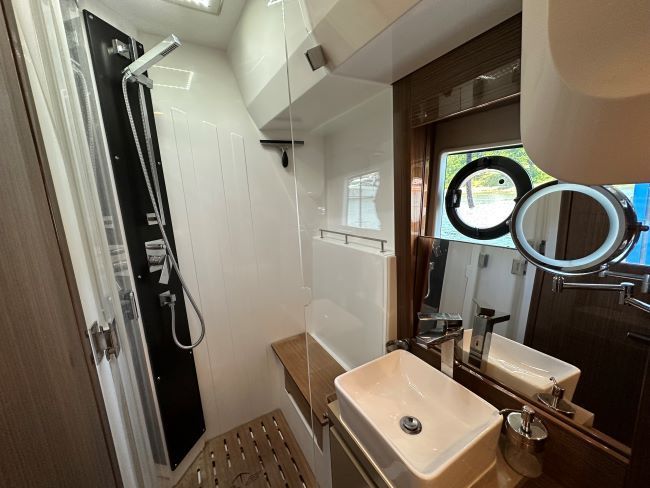 Luxury full beam master cabin with seating to port storage throughout, TV and private en-suite head and separate shower cubicle.