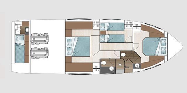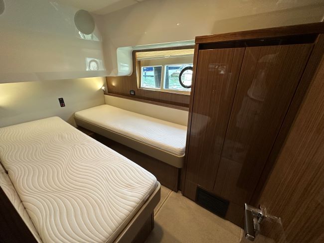 6 berths in 3 cabins with single aft crew cabin in upgrade high gloss walnut cabinetry with leather upholstery