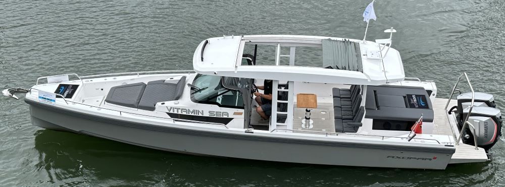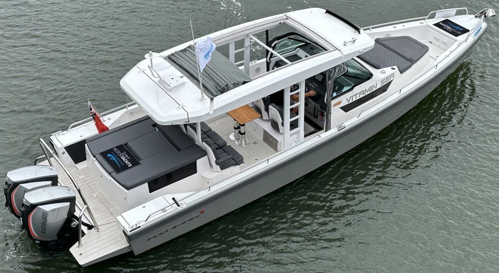 This is a 2018 Axopar 37 Sun Top with an Aft Cabin with a pair of Evinrude 300hp outboard engines that still have warranty until 2028.