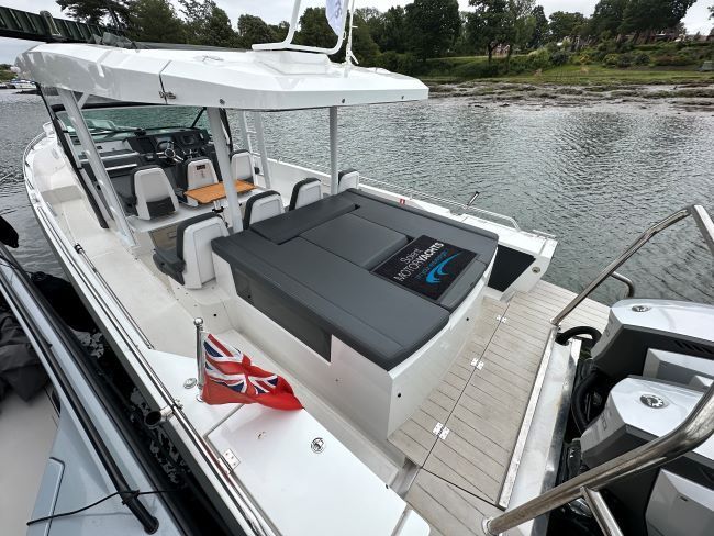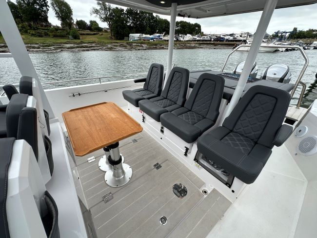 Upgraded Fusion audio with Twin speaker and subwoofer to rear, Twin speakers to cockpit, Twin speakers to Bow, Twin speakers in cabin with remotes at helm and in cabin