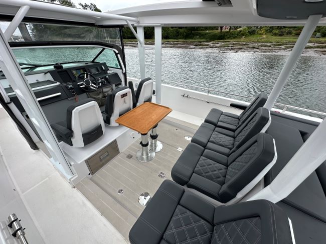 Spacious cockpit with flexible seating for 7, 4 fixed aft seats with 3 helm and co-pilot seats that swivel for alfresco dining while at anchor