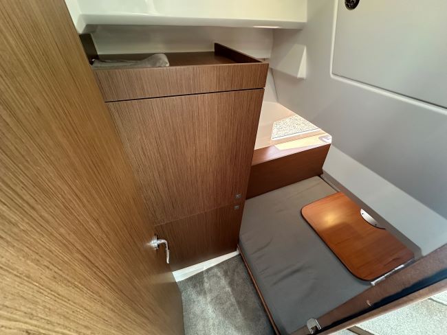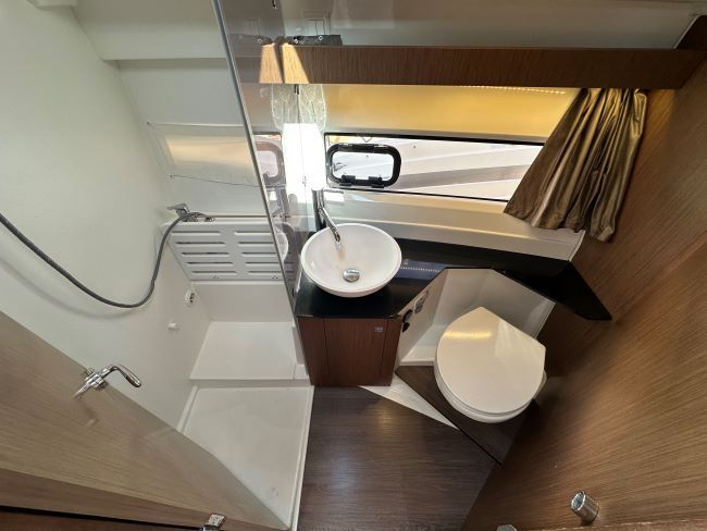 On the interior, you will be impressed by the bright natural light diffused through the opening wide sliding glass doors, and windows in the hull. The Merry Fisher 1095 features important innovations in the distribution of living space. You will be surprised by the numerous storage compartments integrated into the large and fully functional galley, and by the spacious head compartment with separate shower.