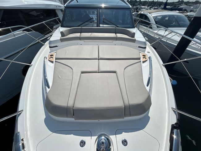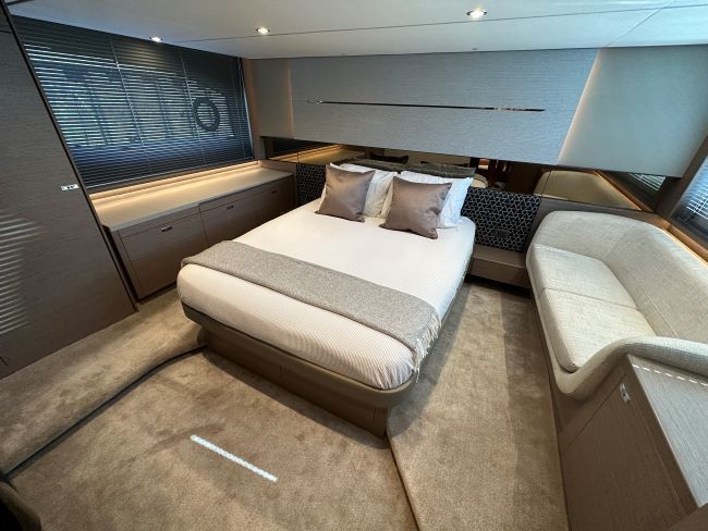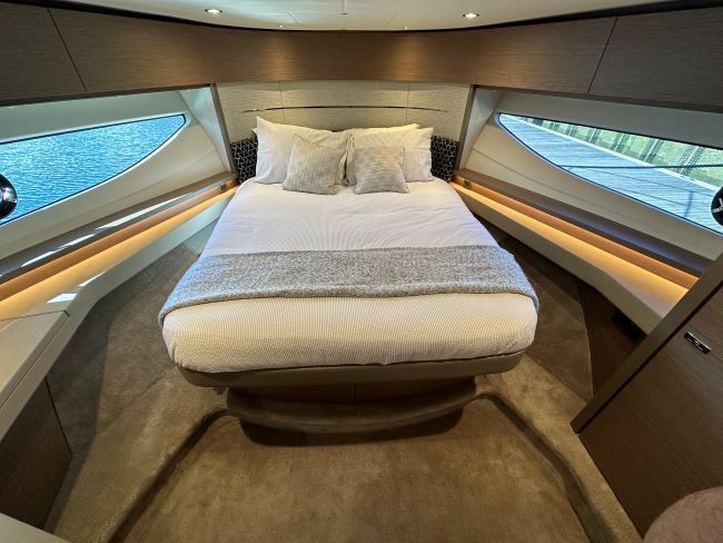 The main deck saloon seating is to port in cream leather with the saloon table upgrade to fold & convert to coffee table with sliding mech & electrically powered pedestal, all opposite the fully equipped galley with optional electrically raising pantry. All combined in a light and spacious saloon that offers a tranquil escape from the heat of the day yet a truly exhilarating ‘open boating’ experience is only a touch of a button away via the large sliding roof.