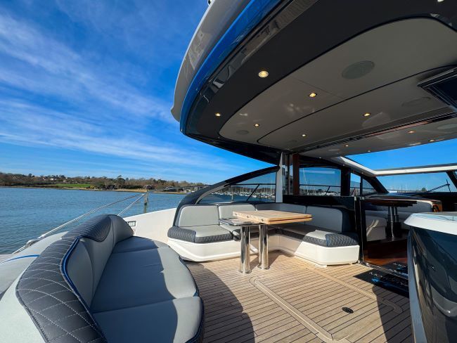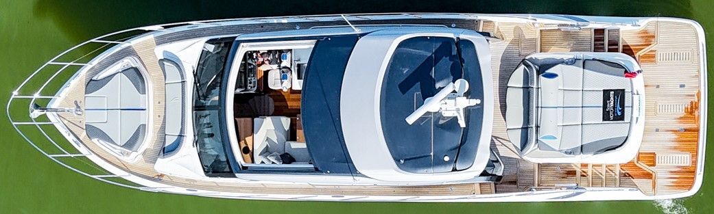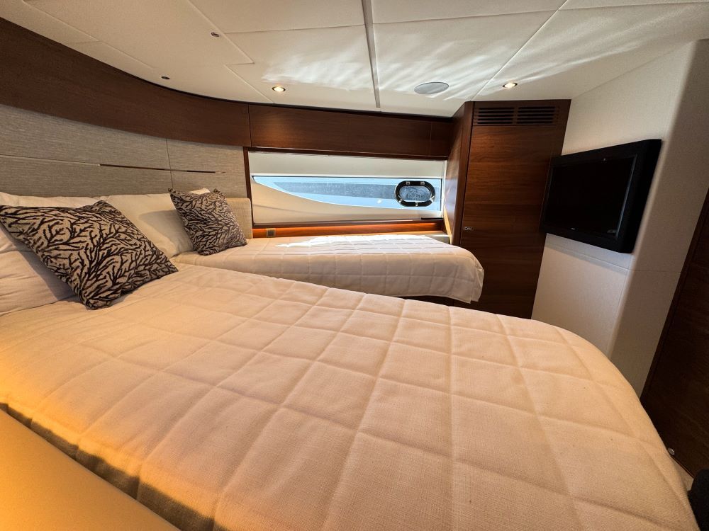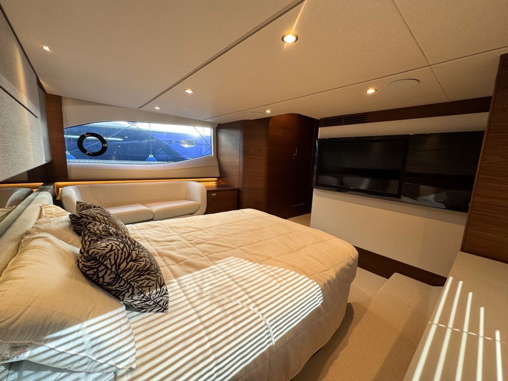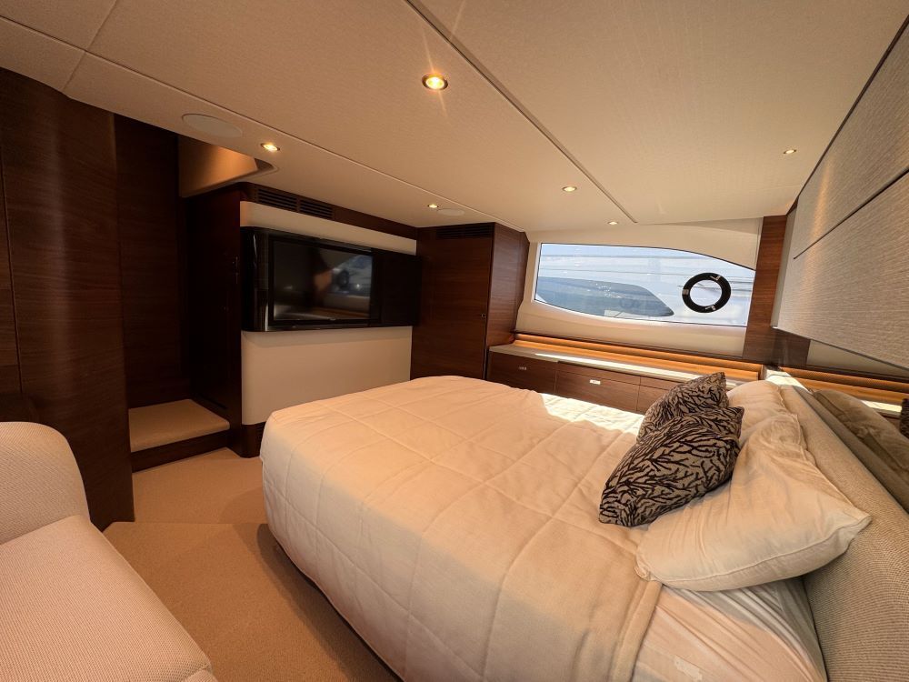 She offers a three cabin and single crew, galley-up layout with a huge cockpit and sunpad, this boat has an electrically operated drop-away patio door that opens up the boat; she also has a pop-up TV that rotates for viewing inside or out!
