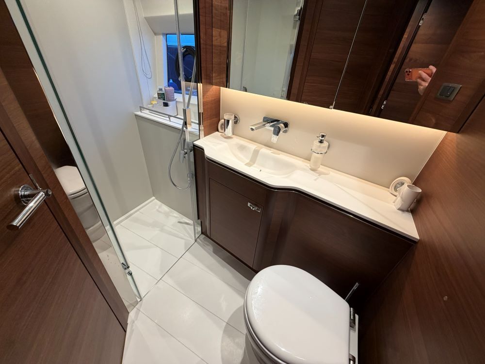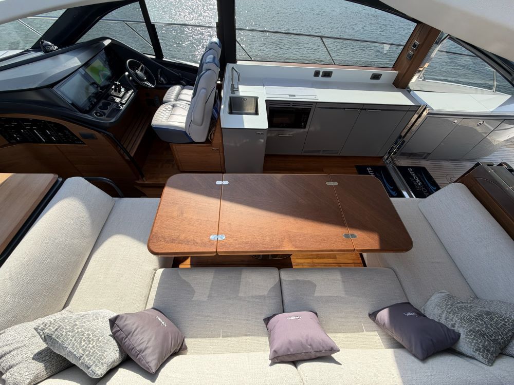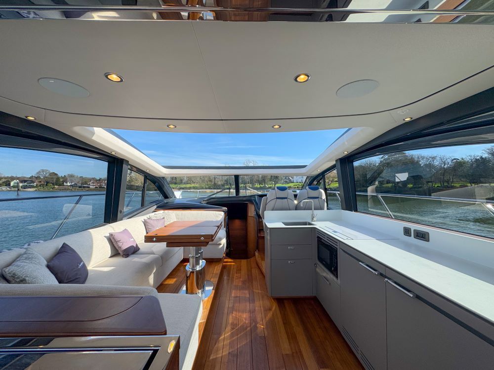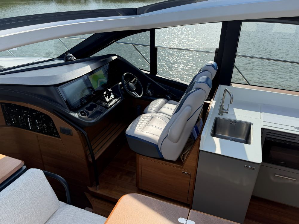The main deck saloon seating is to port in cream leather with the saloon table upgrade to fold & convert to coffee table with sliding mech & electrically powered pedestal, all opposite the fully equipped galley with optional electrically raising pantry. All combined in a light and spacious saloon that offers a tranquil escape from the heat of the day yet a truly exhilarating ‘open boating’ experience is only a touch of a button away via the large sliding roof.