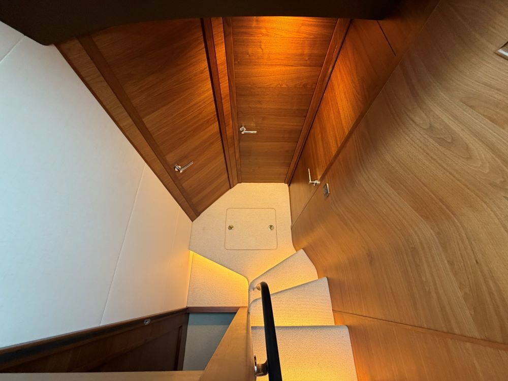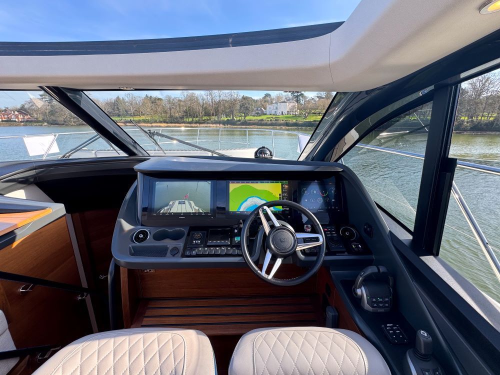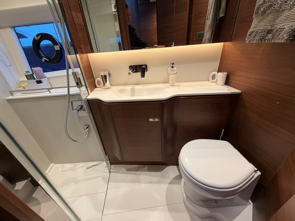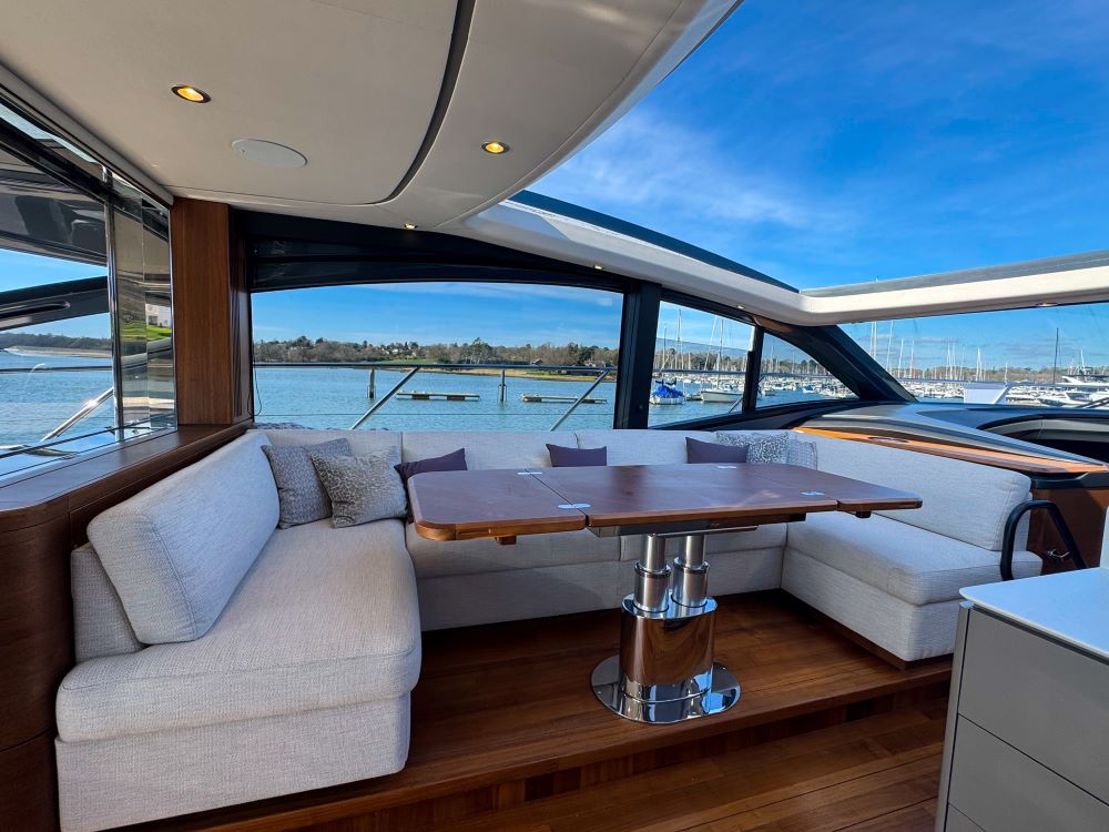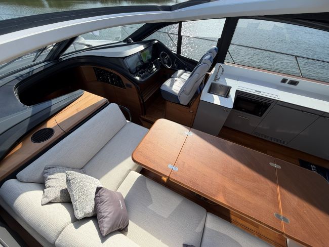 The main deck saloon seating is to port in cream leather with the saloon table upgrade to fold & convert to coffee table with sliding mech & electrically powered pedestal, all opposite the fully equipped galley with optional electrically raising pantry. All combined in a light and spacious saloon that offers a tranquil escape from the heat of the day yet a truly exhilarating ‘open boating’ experience is only a touch of a button away via the large sliding roof.