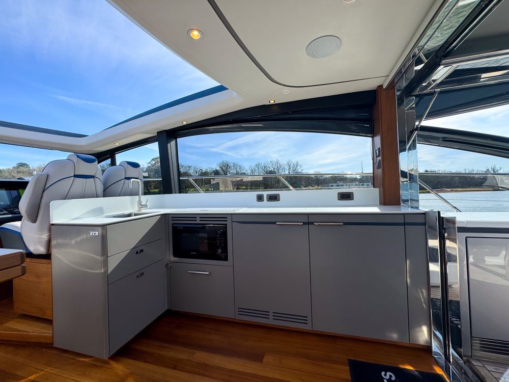 Cockpit wetbar including BBQ, sink, top loading fridge and storage