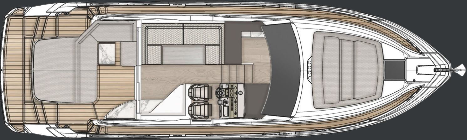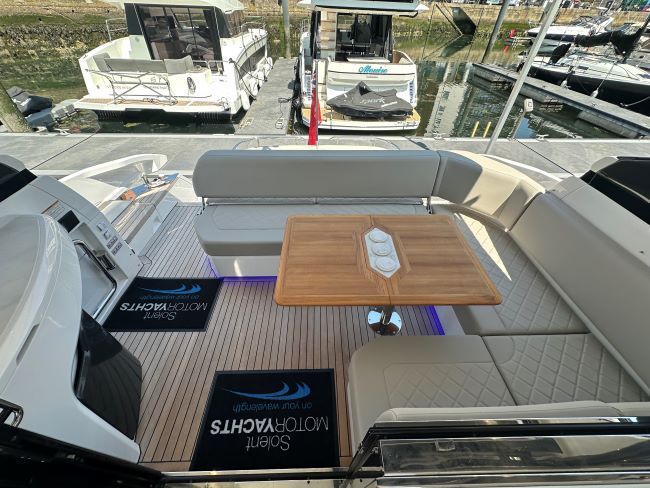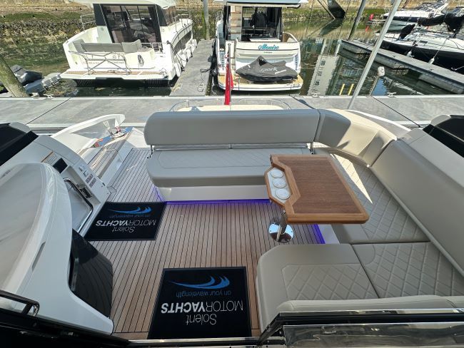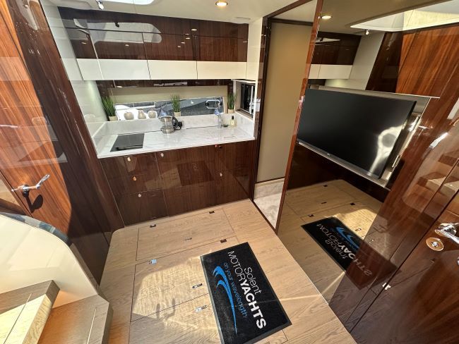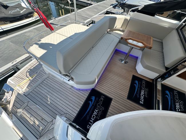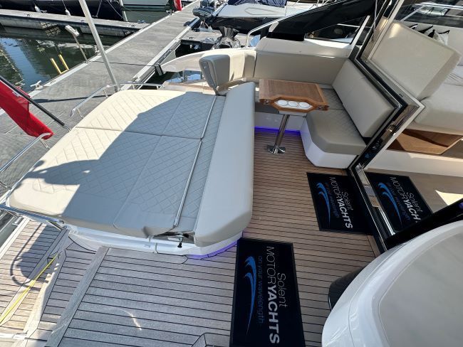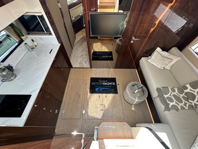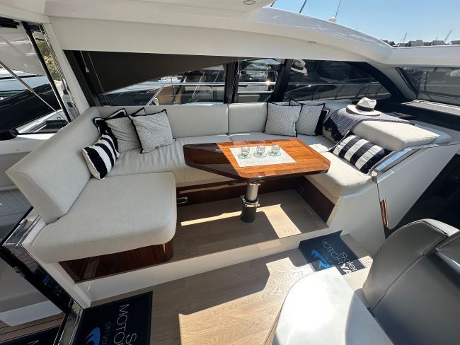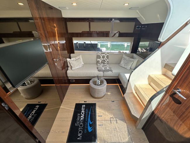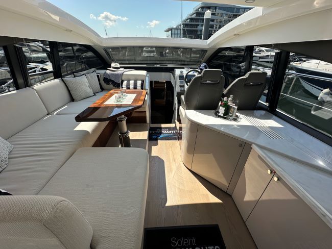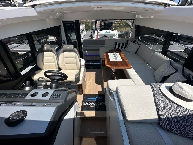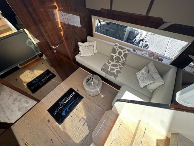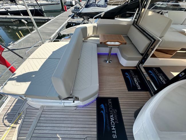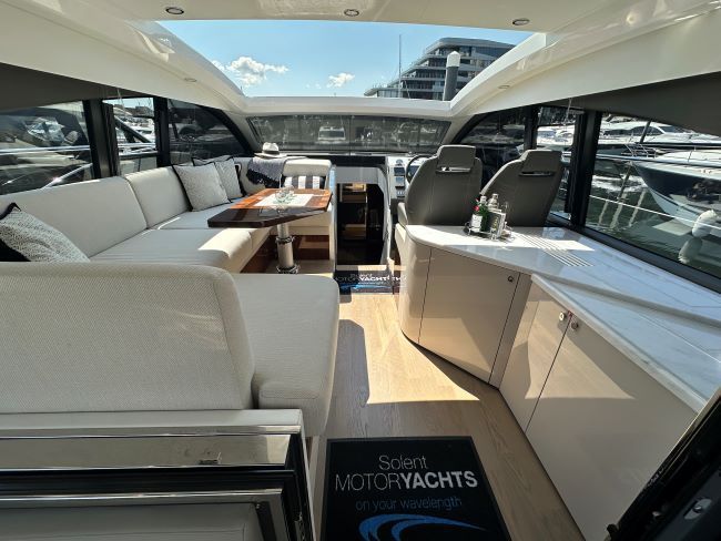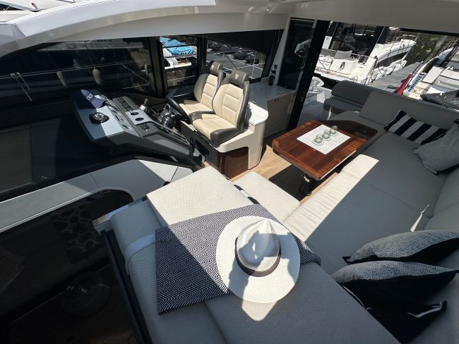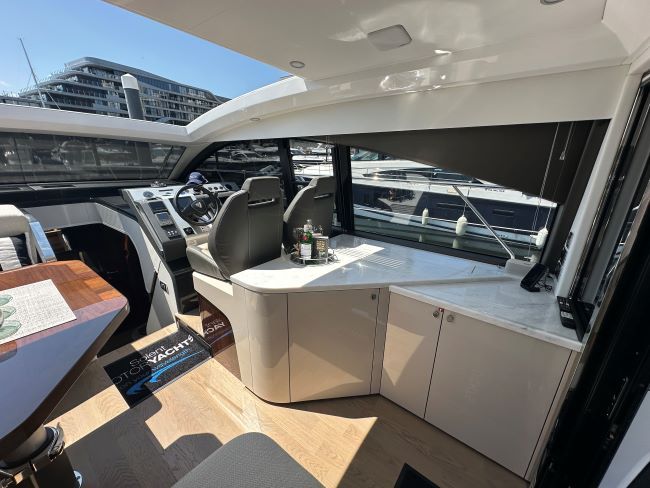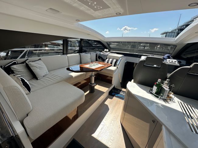 Spacious deck saloon to port in cream leather with hi-lo table (converts to additional berth if required) opposite the helm and entertainment unit with pop up TV, additional drinks fridge, drinks cabinet and storage.