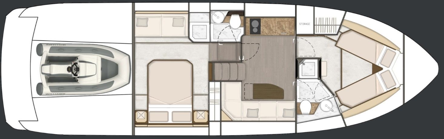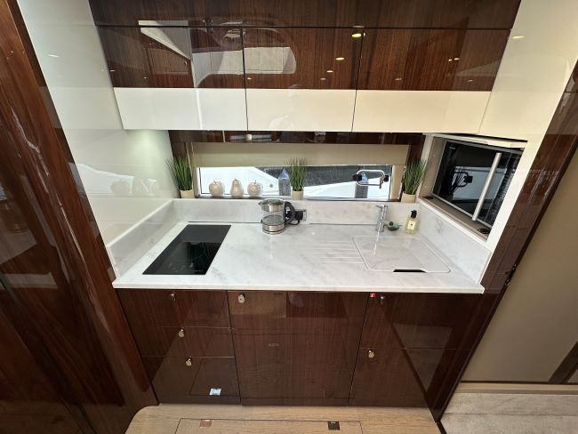 Lower dinette seating area (converts to a double berth if and when required) to starboard opposite the galley which comprises of storage for Fairline cutlery and crockery and all the essential requirements.