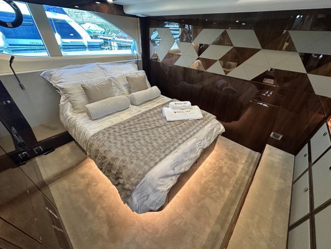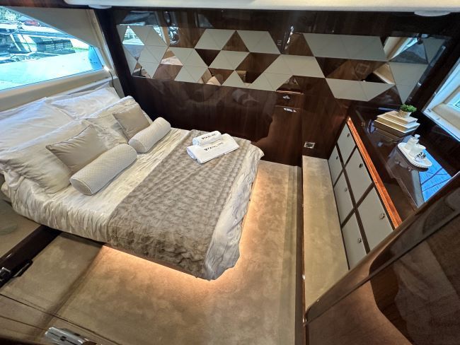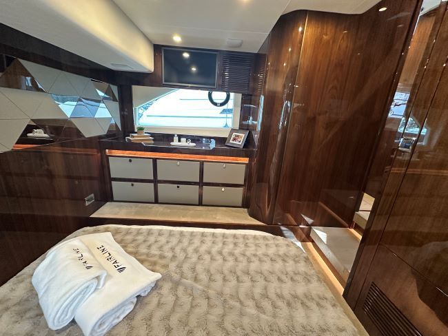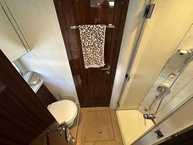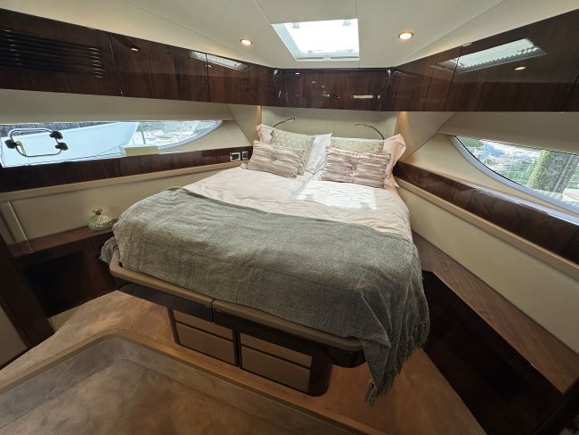 Forward VIP guest cabin with scissor action berth (twin or double), storage below berth and high level lockers, wardrobe, TV, with en-suite access to day head and shower.