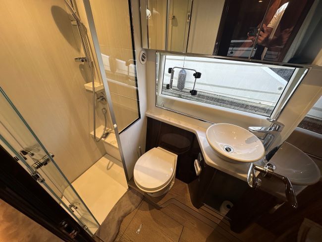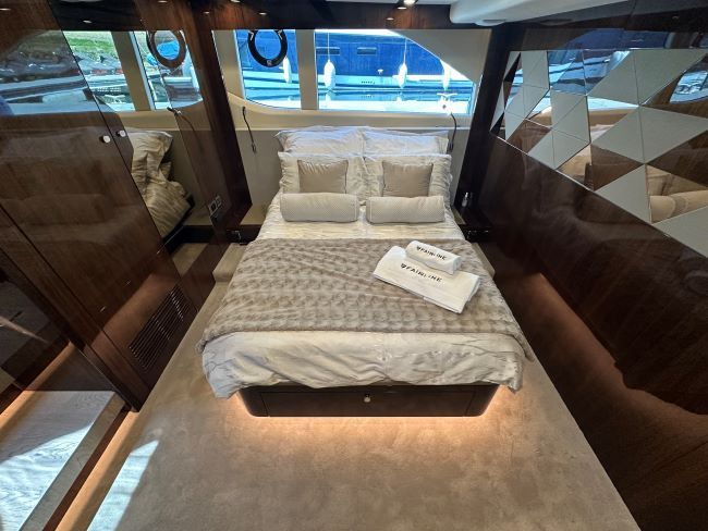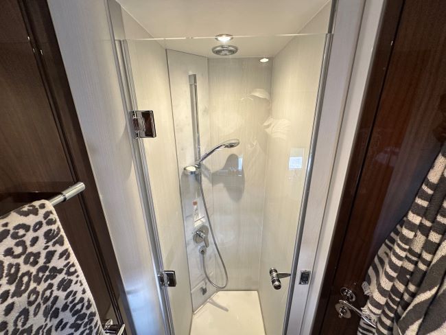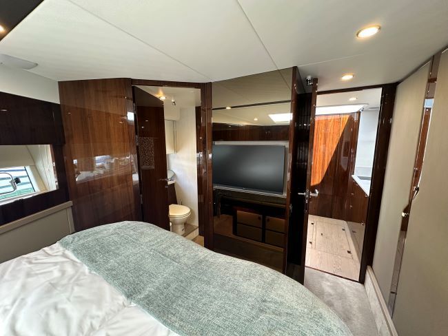 Full width Master midship cabin, an island double berth with sprung mattress, drawers below, vanity drawer and mirror, TV, wardrobe and storage, together with a spacious en-suite head and shower.