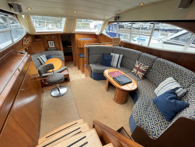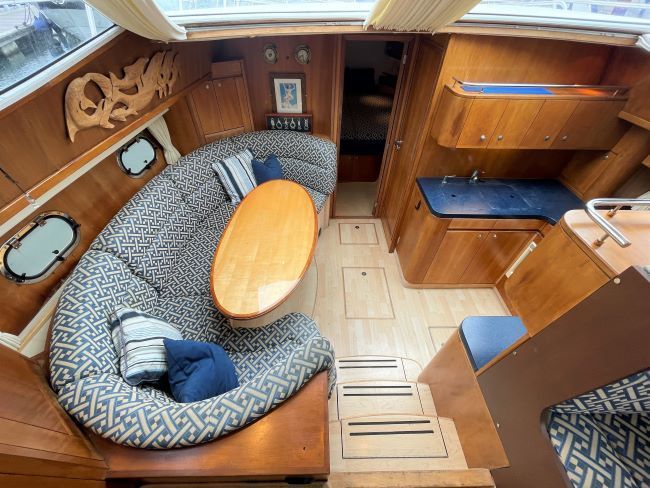 Starboard Side: C-Shaped settee with stowage under. Coffee table in cherry and maple. Engine access through aft cabin steps and panels in floor for easy daily checks.
