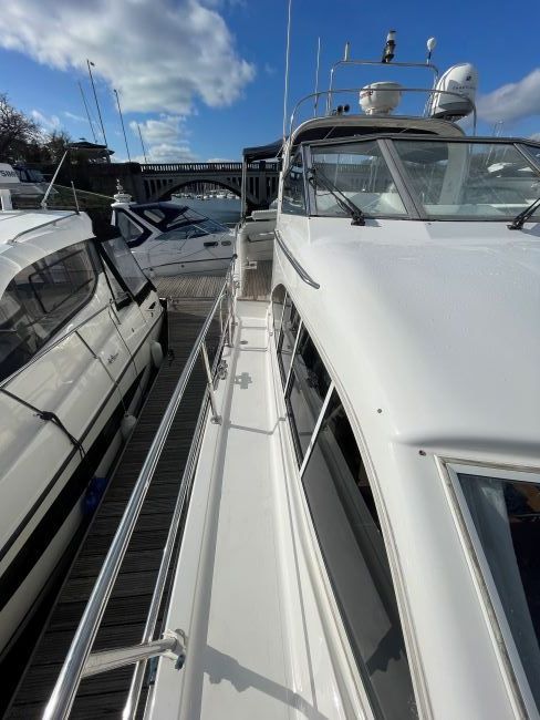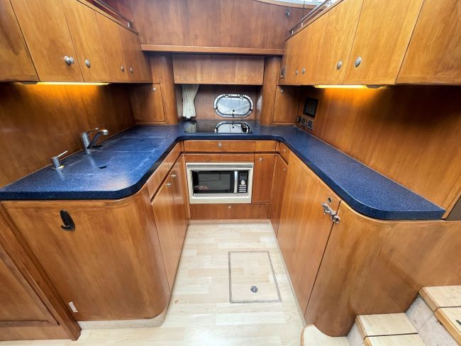 American cherry timber and veneer, matched throughout the vessel. Cream carpets to cabins and saloon with light maple flooring to dinette and galley. Matching patterned upholstery in dinette and in the saloon. 2 double en-suite cabins.