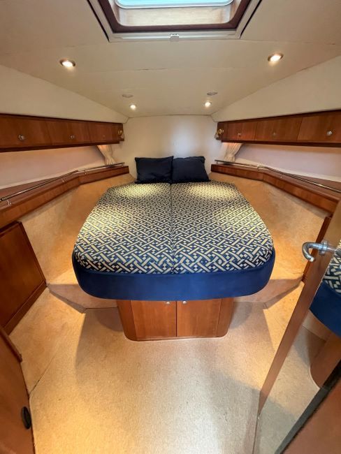 King-size island double bed, access for maintenance to steering under berth. High level storage lockers. 1 x Full length hanging locker. Drawer unit and further locker space. Escape hatch.