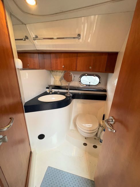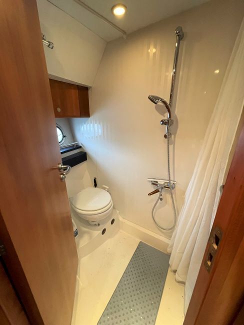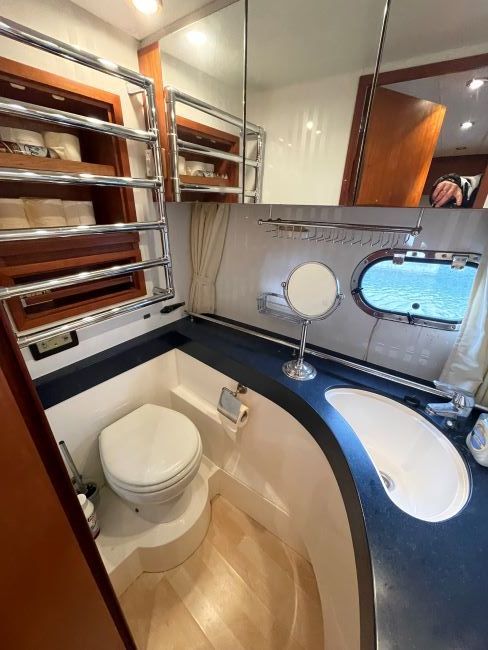 Vanity unit with Corian top. Shaving socket and mirror. Electric extractor. Shower cubicle. Manual W.C. to sea or holding tank.
