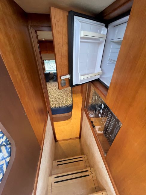 Storage facilities at both high and low levels. Corian worktop. Maple floor. Sink with mixer taps. Extractor fan. New Sharp combo microwave oven, 4 burner electric hob, fridge with small freezer compartment. Waste bin. Under floor dry goods storage. Water tank level gauge. Switch panel for generator.