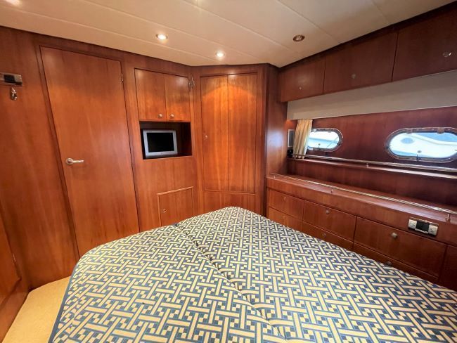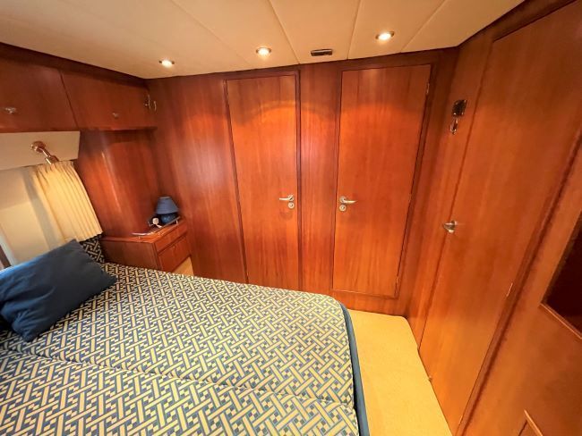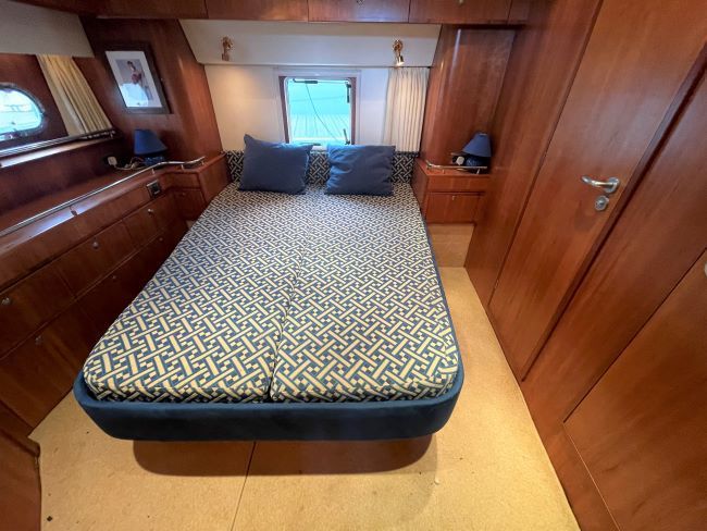 King-size double bed with storage facility under. High level storage lockers port/starboard. 1 x Full length hanging locker. Vanity unit and further locker space. En-suite access to day head.