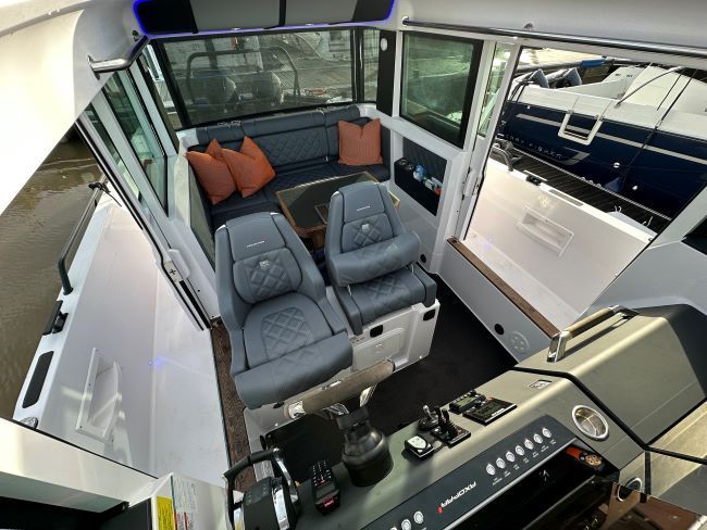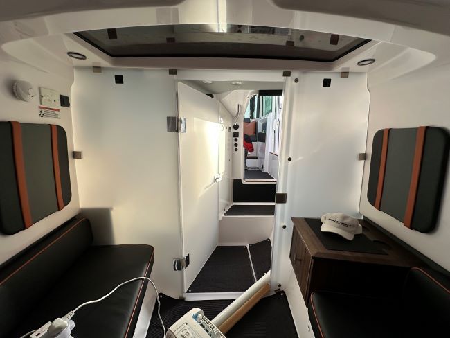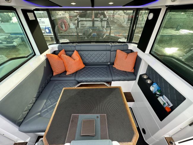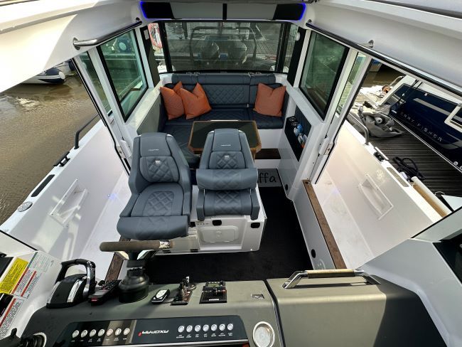 This boat is one of a kind with unique custom modifications to make extra outdoor seating on board and internally she has been reupholstered in a bold black and orange colour scheme.