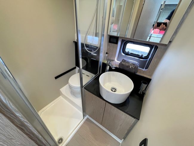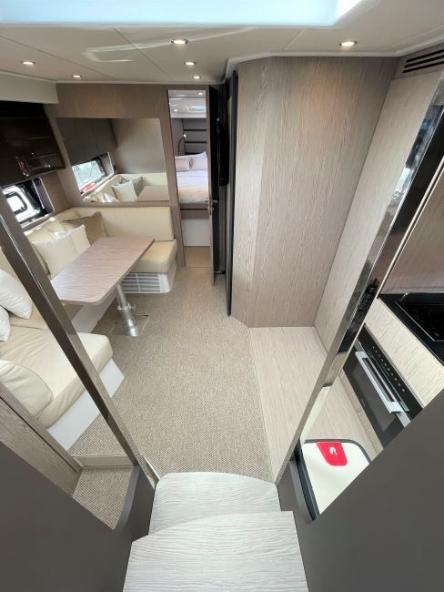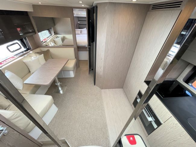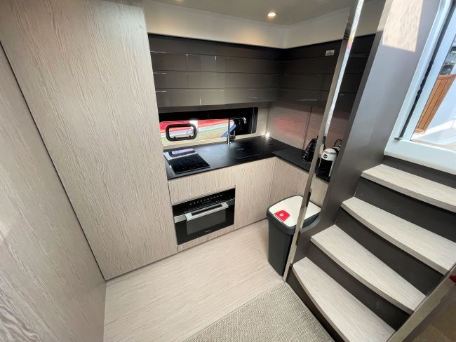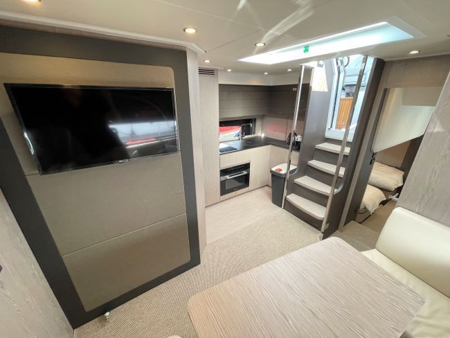 The airy lower deck living area is the alignment of two essential stations, the dinette lounge that coverts to a double as and when required or simply if you wish your feet up to watch the TV. A fully equipped galley to starboard with a full sized fridge and freezer, Miele combination over, elec hob, sink and plenty of storage with Azimut cutlery and crockery. The layout sets them almost opposite, opening up common space in the square room.