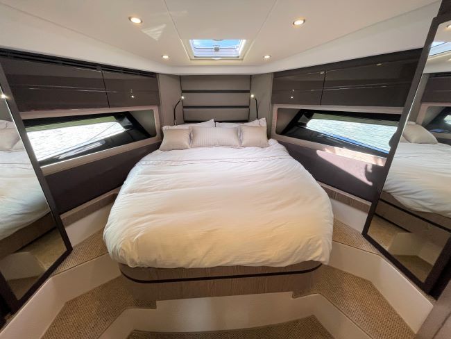 The forward master suite enjoys a large island double berth, long hullside windows, full-height walking room and an private en-suite bathroom with separate shower cubicle.