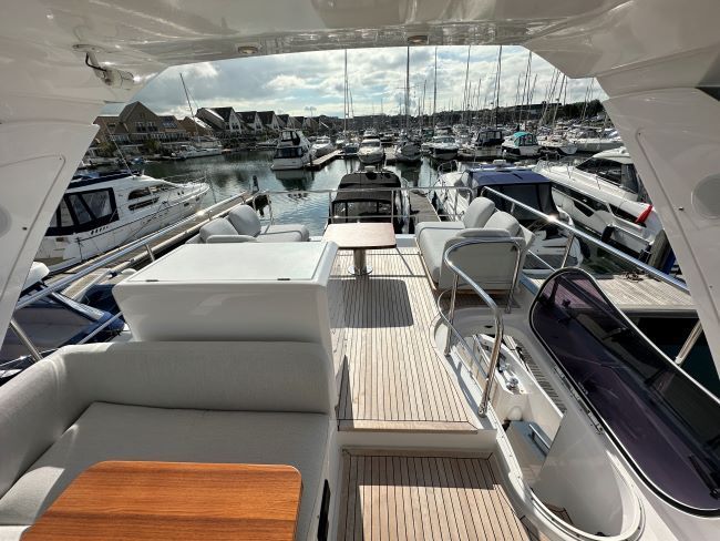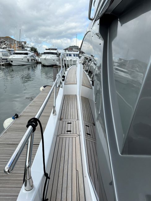 Teak decking all over - bathing platform, cockpit, side deck, flybridge steps and full flybridge