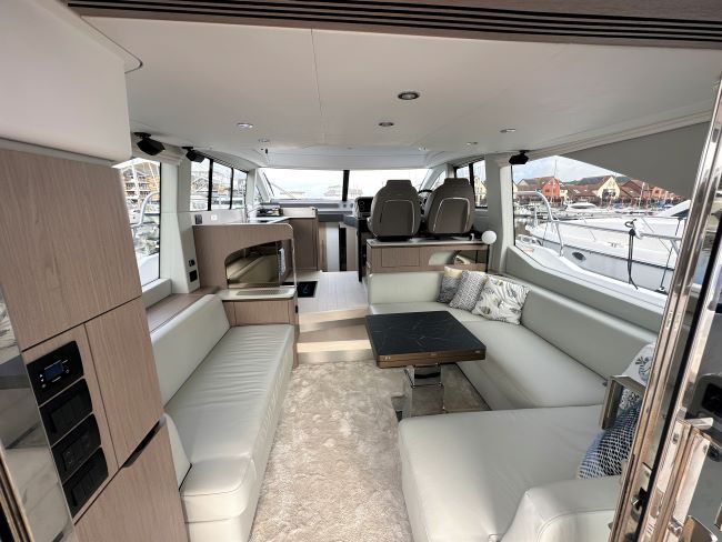 Large cockpit with C shaped seating, large table, lazerrette under the seating and engine access via cockpit sole.